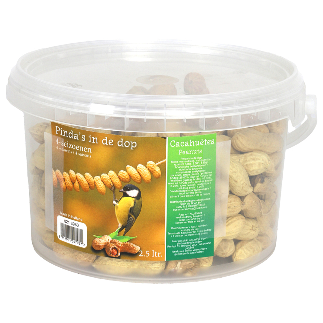 Deze handige emmer van 2,5 liter zit boordevol hoogwaardige 4-seizoenen doppinda's, een natuurlijke en energierijke lekkernij voor tuinvogels en eekhoorns. Pinda's zijn rijk aan vetten en eiwitten en vormen daarmee een uitstekende voedingsbron tijdens iedere tijd van het jaar.