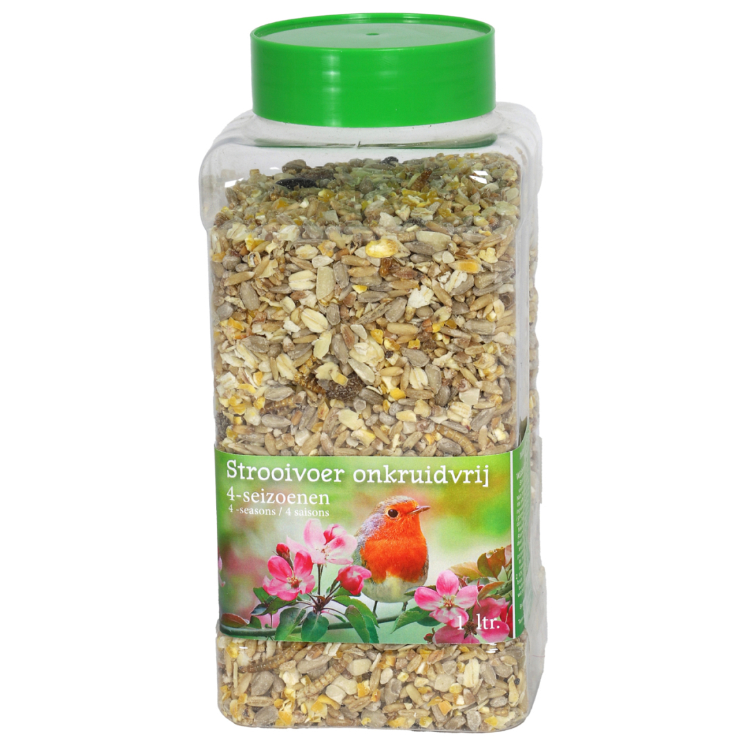 Dit speciale 4-seizoenen strooivoer is vrij van zonnebloempitschillen waardoor het direct genot biedt voor alle vogels zonder je zorgen te hoeven maken over de achtergebleven rommel, of opkomende zonnebloemen. De toegevoegde meelwormen zorgen voor de broodnodige extra eiwitten, terwijl onder andere de merels dol zijn op de toegevoegde rozijnen. Doordat alle zaden gebroken zijn, wordt wordt onkruidgroei bij de voederplek voorkomen, waardoor je tuin schoon blijft en een gastvrije plek blijft voor vogels.