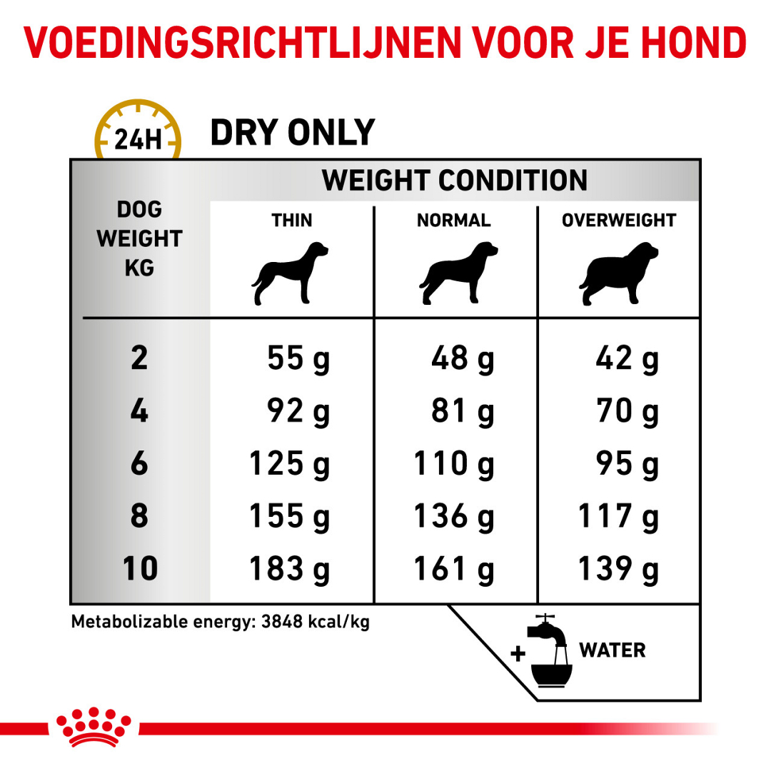 Omdat dit een Royal Canin dieetvoeding is, is het belangrijk dat je deze voeding alleen aan je hond geeft als dit is geadviseerd door je dierenarts. Mocht je overschakelen naar deze voeding, doe dit dan geleidelijk in een tijdsbestek van 7 dagen. Zorg dat je elke dag zorgvuldig de juiste hoeveelheid voeding afweegt, zeker in combinatie met natvoeding.