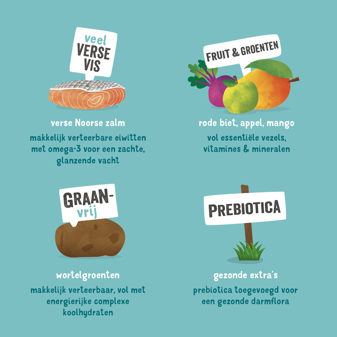 Samenstelling: verse zalm 40%, aardappelen, erwten, erwteneiwit, lijnzaad, visolie, groentesaus, mineralen, mannan-oligosachariden (MOS), fructo-oligosachariden (FOS), rode bieten 0,04%, appels 0,04%, mango 0,04%, avocado 0,04%, kokosnoot 0,04%, spinazie 0,04%, zwarte bes 0,04%, goudsbloemblaadjes, brandnetel, braambesblaadjes, venkel, karwij, kamille, melisse.