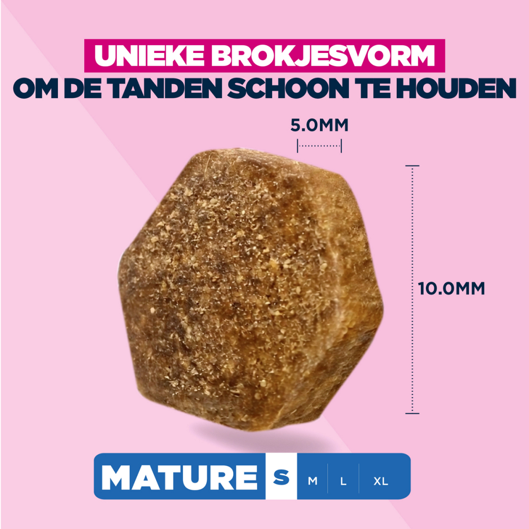 Eukanuba Life Care Mature S Chicken, samengesteld met verse kip, is speciaal ontwikkeld voor kleine, oudere honden van 8 tot 11 jaar. De geselecteerde ingrediënten bieden voeding op maat om gezond ouder te worden en de algehele vitaliteit te ondersteunen. L-Carnitine helpt bij de vetverbranding, waardoor jouw hond een optimaal gewicht kan behouden en de gewrichten minder worden belast. De aangepaste vezelmix van prebiotisch FOS en bietenpulp zorgt voor een gezonde spijsvertering, terwijl glucosamine de gezondheid van de gewrichten ondersteunt en calcium voor sterke botten zorgt. Natuurlijke bronnen van omega 6- en omega 3-vetzuren bevorderen een gezonde huid en een glanzende vacht, terwijl een antioxidantenmix met vitamine E het immuunsysteem van jouw hond helpt versterken. Verder helpen de unieke zeshoekige brokjes van Eukanuba, in combinatie met het DentaDefense tandverzorgingssysteem, om op lange termijn een schoon en gezond gebit te behouden.
