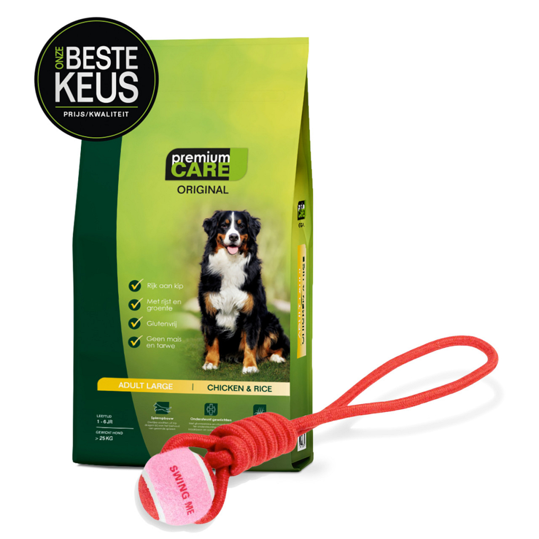 Premium Care Original - Adult Large Chicken & Rice is een glutenvrije, complete droge hondenvoeding voor volwassen honden van grote rassen. Deze speciale formule beantwoordt perfect aan de voedingsbehoeften van grote hondenrassen en draagt bij tot soepele gewrichten en optimale levenskwaliteit.