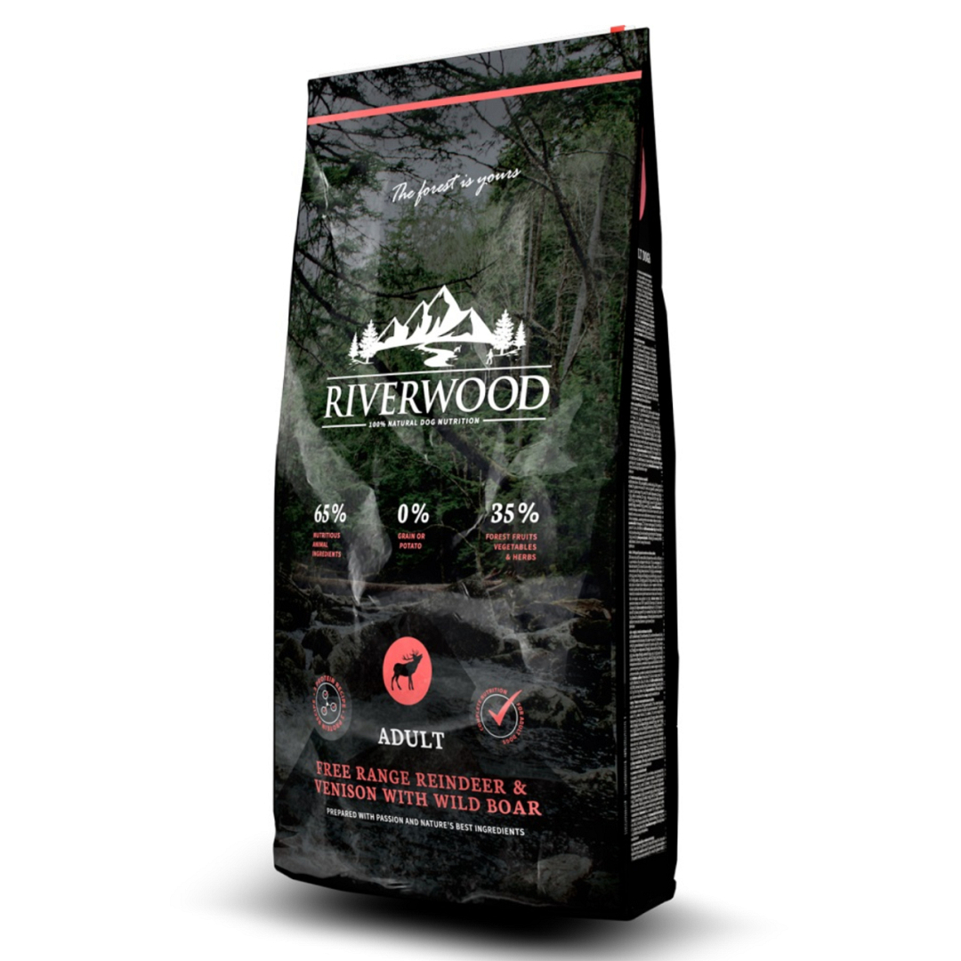 Riverwood Adult Reindeer & Venison with Wild Boar 2 kg is een graanvrije/aardappelvrije formule op basis van 3 eiwitbronnen voor volwassen honden.