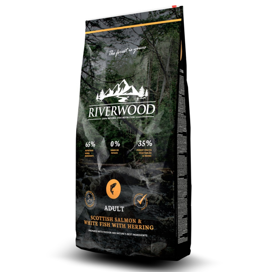 Riverwood Adult Scottish Salmon & White Fish with Herring 2 kg is een graanvrije/aardappelvrije formule op basis van 3 eiwitbronnen voor volwassen honden.