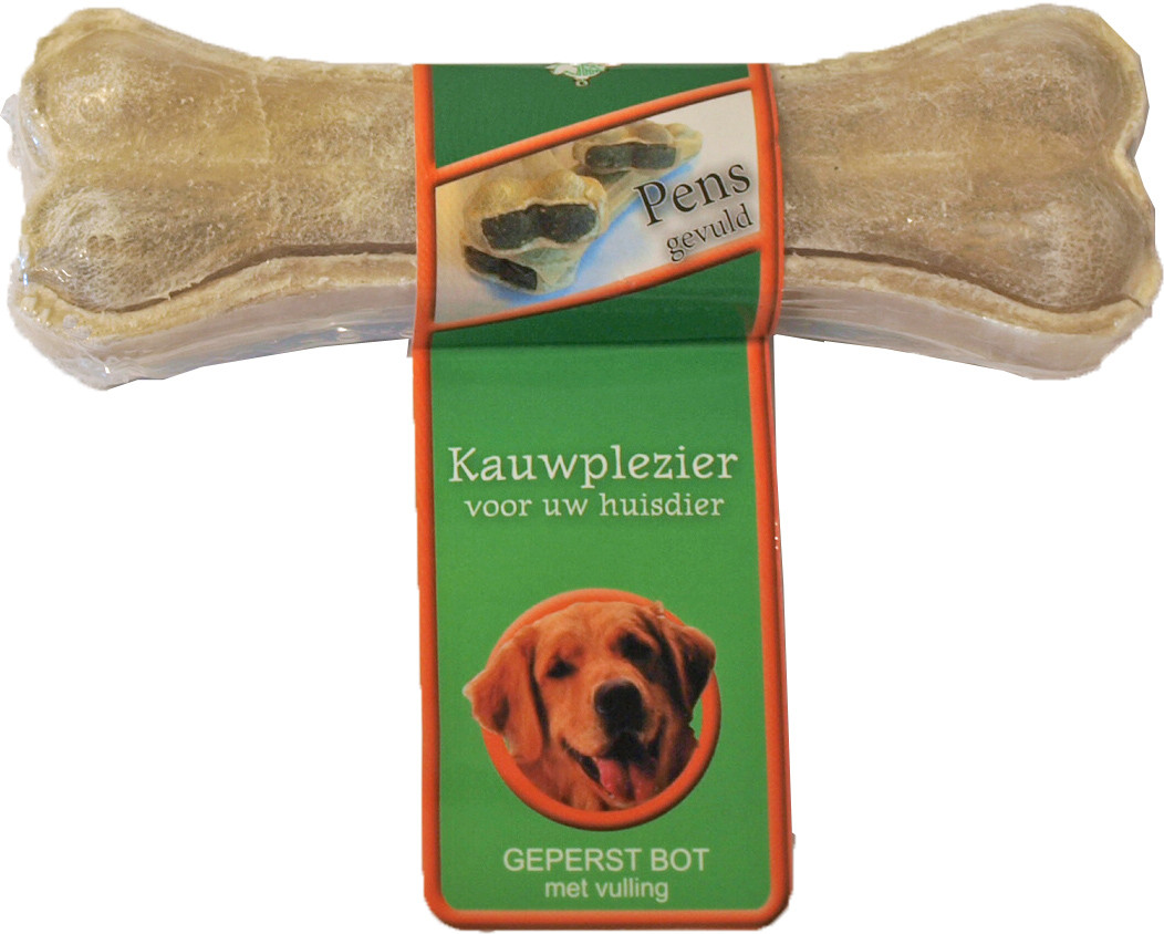 Dit geperste bot van buffelhuid gevuld met pens is 100% natuurlijk. De pensvulling maakt dit bot onweerstaanbaar lekker en de buffelhuid buitenkant zorgt voor extra lang kauwplezier.