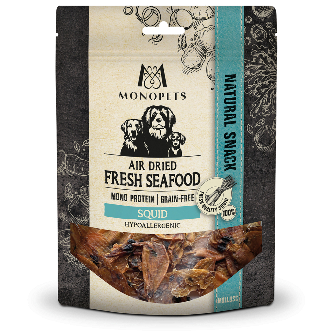 Monopets air dried snacks Fresh Fish Sea Food Squid is een smaakvolle hondensnack op basis van één dierlijke eiwitbron. Deze graanvrije en hypoallergene snack van inktvis is een natuurlijke traktatie en bevat zorgvuldig geselecteerde ingrediënten. Het product is geschikt voor alle levensfasen.