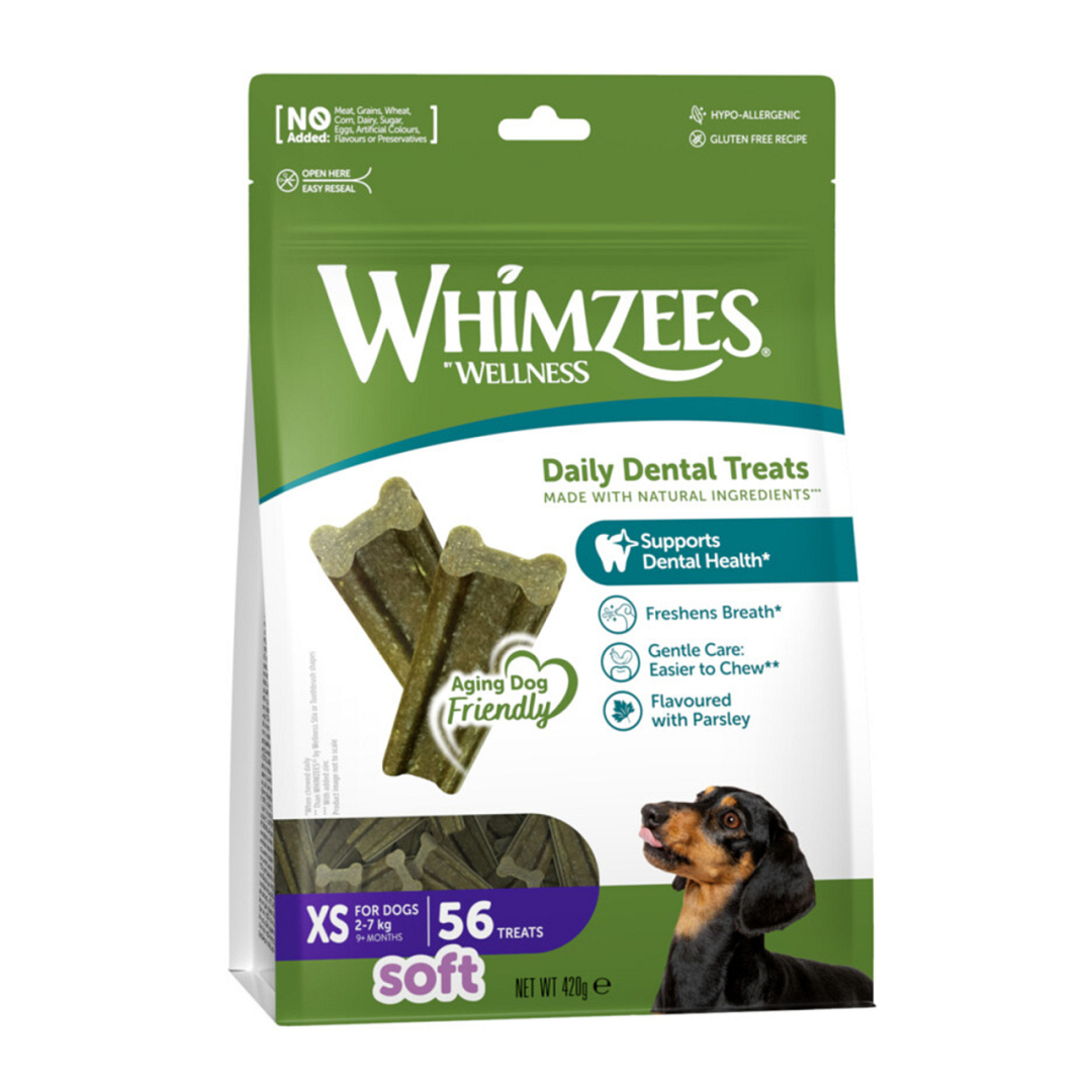 Met de Soft snack heeft Whimzees een kauwsnack ontworpen voor zachte kauwers en oudere honden. Deze Soft snack zorgt naast een milde gebitsreiniging ook voor een frisse adem. Door de nieuwe soft formule met erwten, is deze snack veel zachter en dus makkelijker te kauwen voor de zachte kauwers en honden met gebitsproblemen. Uiteraard is de soft snack ook 100% natuurlijk, graan en gluten-vrij, en volledig geproduceerd volgens een 100% plantaardige formule.