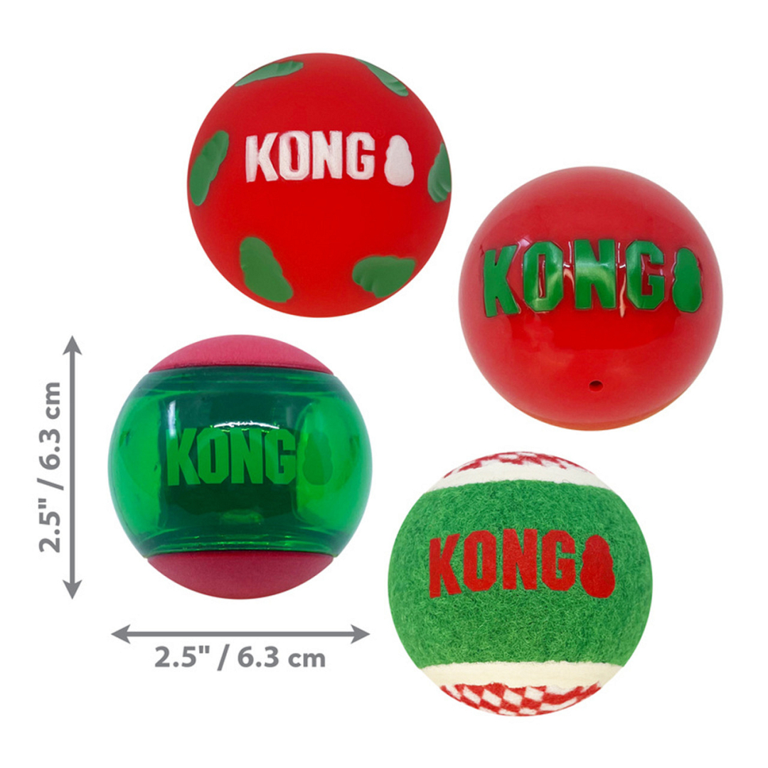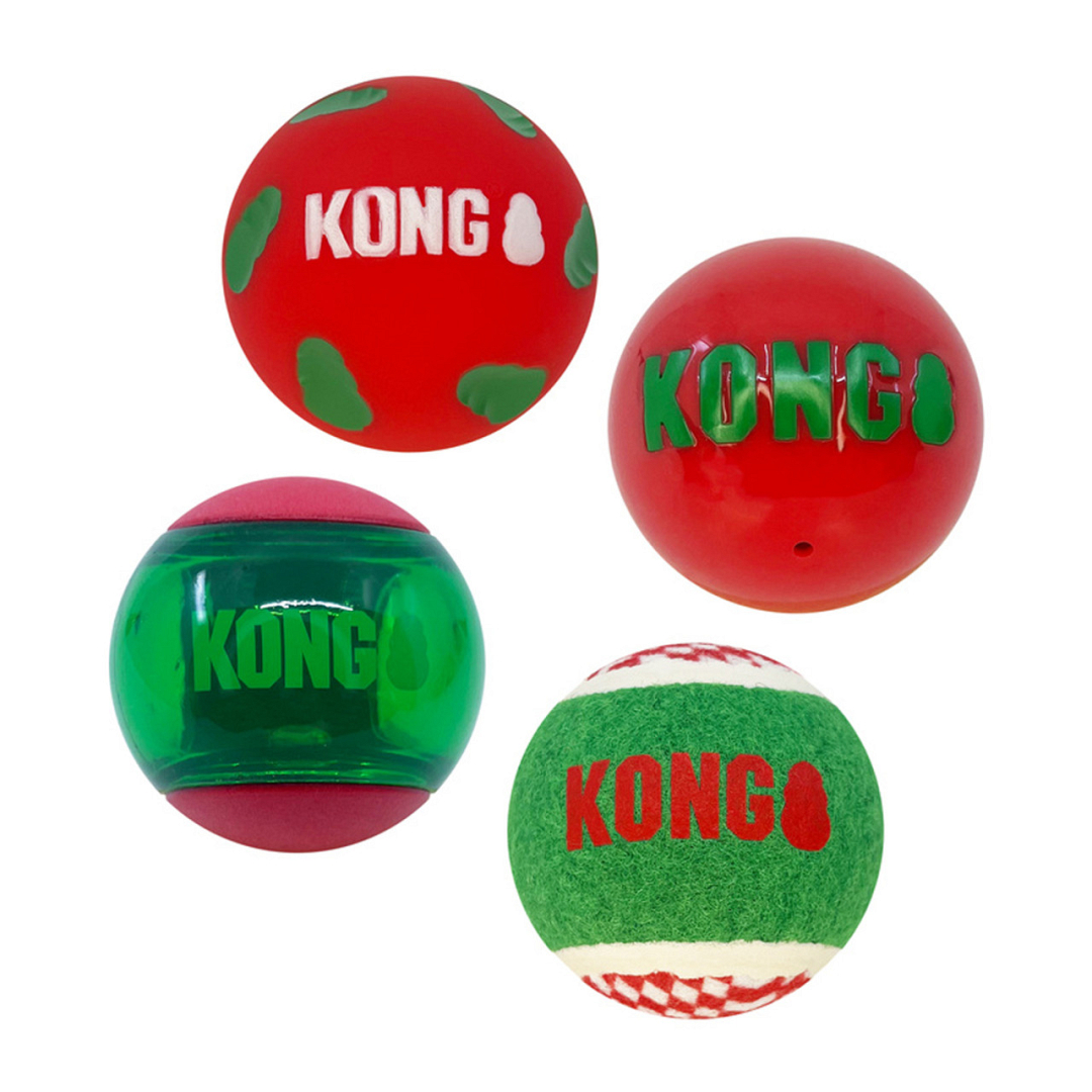 Set met vier versies van de bekende KONG ballen, elk met een unieke textuur. Goed voor uren speelplezier.