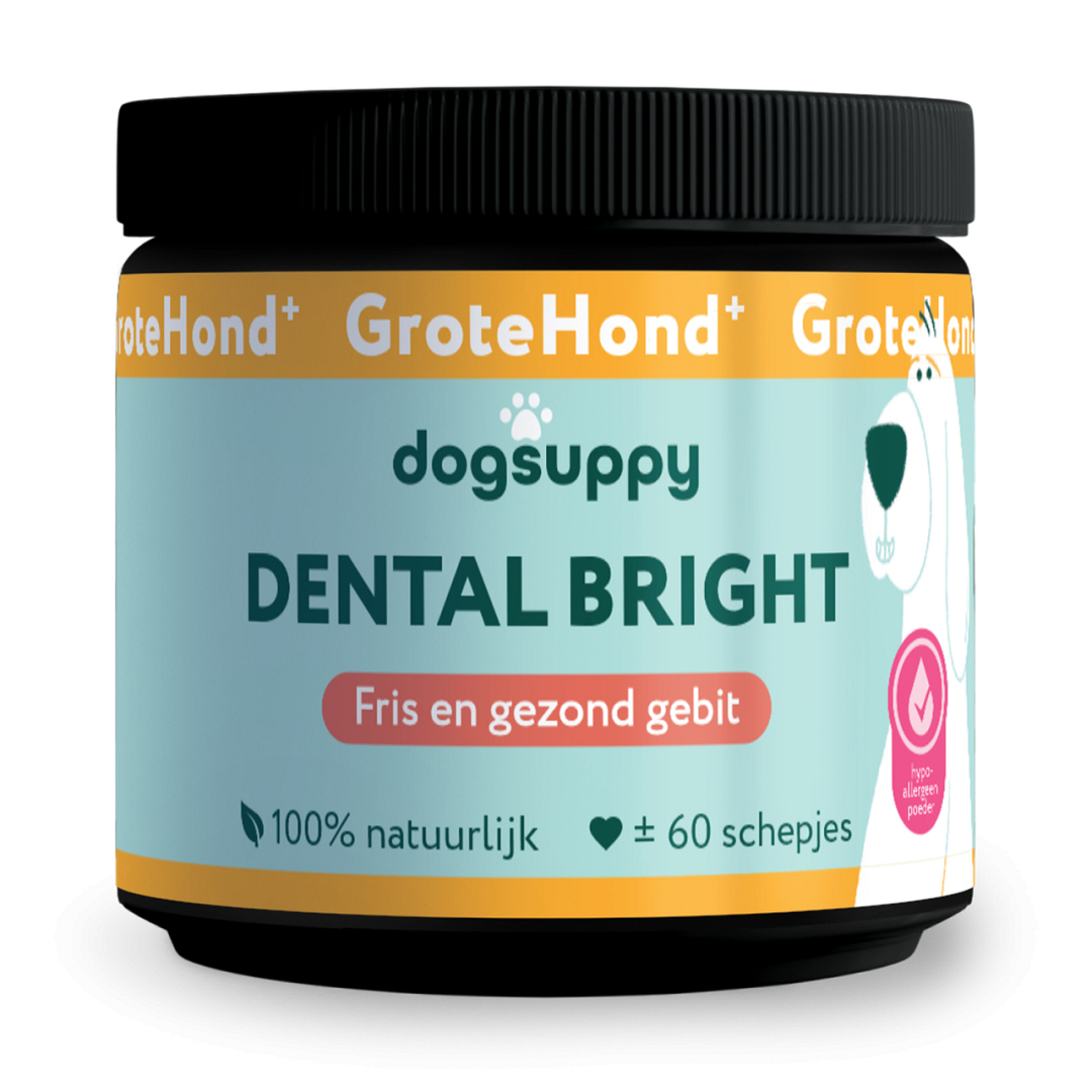Het Dogsuppy Dental Bright poeder bevat bruine algen, die ervoor zorgen dat je hond meer speeksel aanmaakt. Speeksel is essentieel voor een goede mondhygiëne, omdat het voedselresten wegspoelt en ongewenste bacteriën helpt verminderen. Dit ondersteunt het verminderen van tandplak. Bovendien bevat elke schep ongeveer 1 miljard goede bacteriën (pre- en probiotica) die bijdragen aan het evenwicht van bacteriën in de mond van je hond. Dit resulteert in minder tandplak, een frissere adem en een gezonder gebit. Natuurlijke ingrediënten zoals pepermunt en eucalyptus zorgen daarbij voor een extra frisse adem.