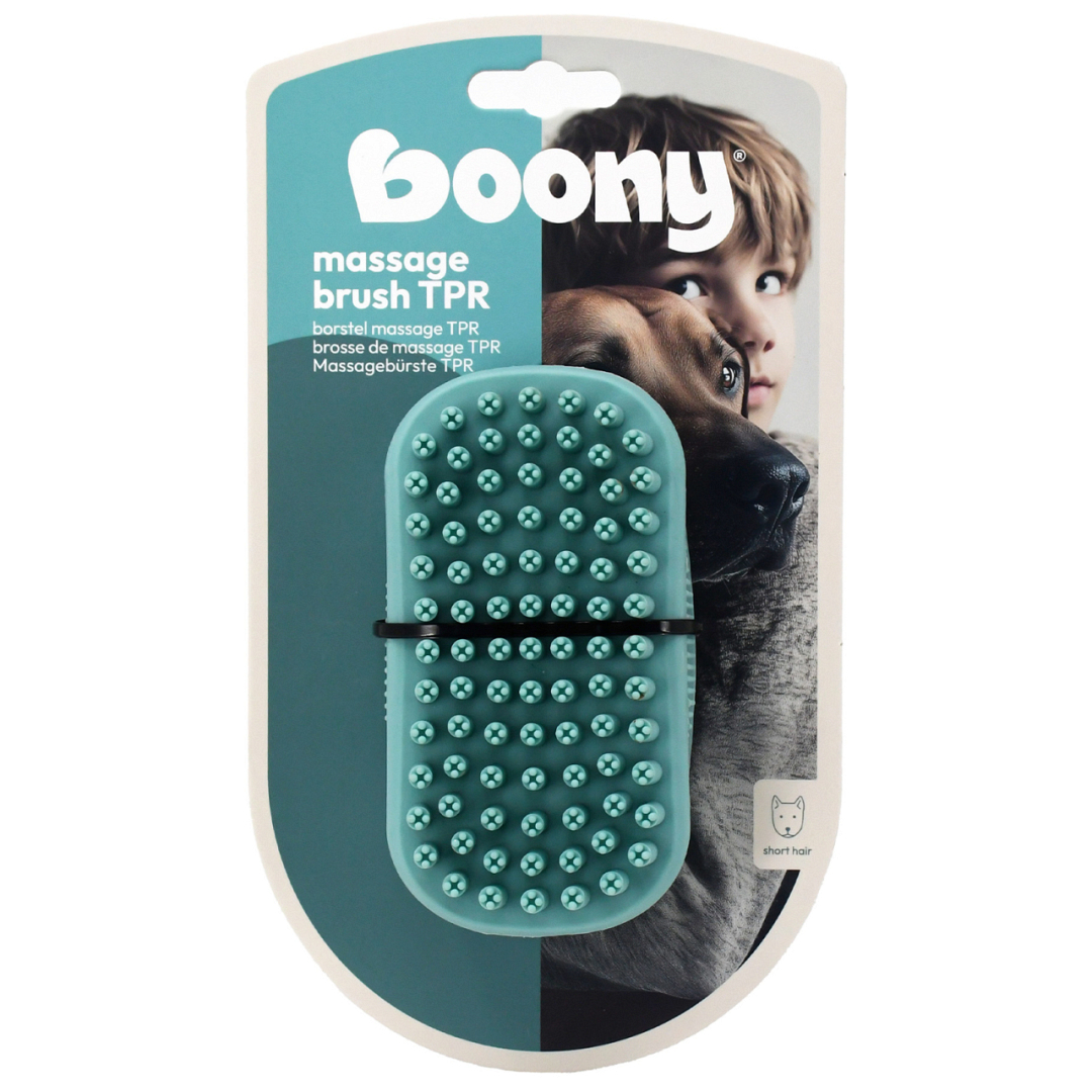 Deze Boony Rubberen massageborstel is perfect voor het verzorgen van de vacht van je hond. Door stevig over de huid te wrijven, verwijderen de speciaal gevormde rubber uiteinden moeiteloos dode huidcellen, vuil en losse of dode haren. Tegelijkertijd geef je de huid een zachte massage die de natuurlijke huidfuncties stimuleert.