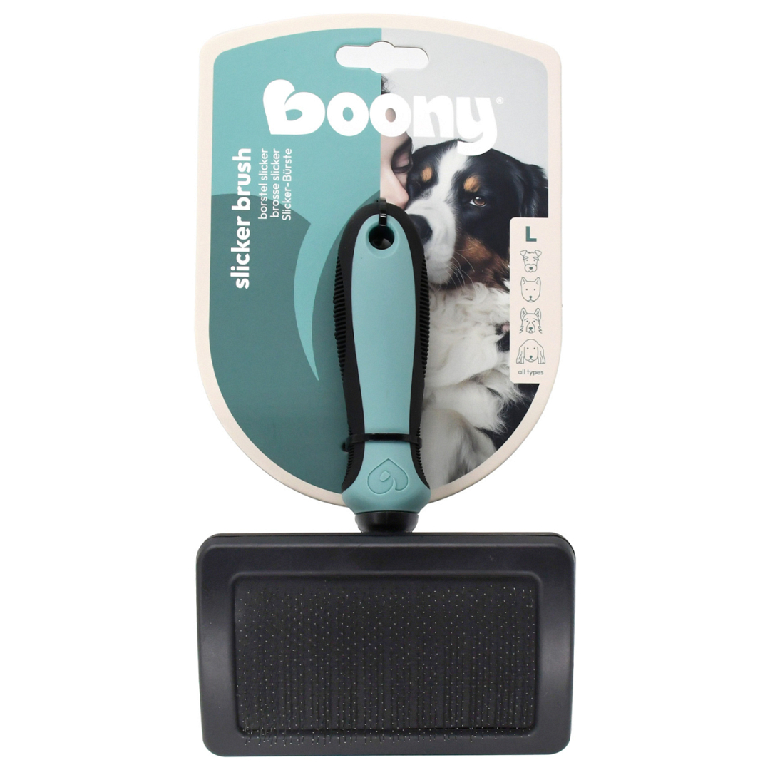 De Boony Slicker is speciaal ontworpen om zowel de boven- als ondervacht grondig te verzorgen, zonder de huid te belasten. Voor honden met een dichte, zware of dubbele vacht is een gewone borstel vaak niet voldoende.