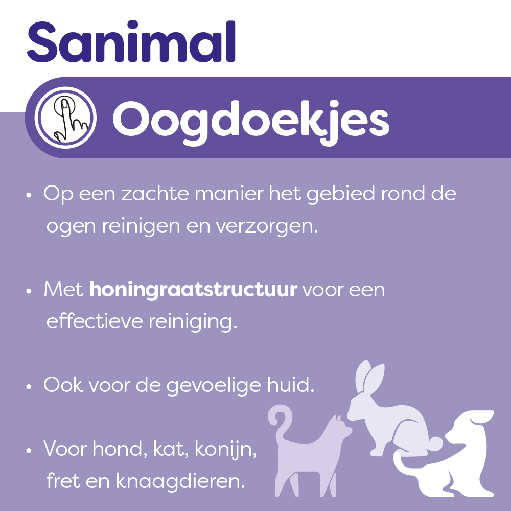 Sanimal oogdoekjes zijn speciaal ontwikkeld voor het regelmatig reinigen van de ogen en traanstrepen van huisdieren. Dankzij de handige individuele doekjes kun je de ogen eenvoudig en hygiënisch schoonmaken. De doekjes hebben een honingraatstructuur voor een effectieve reiniging.