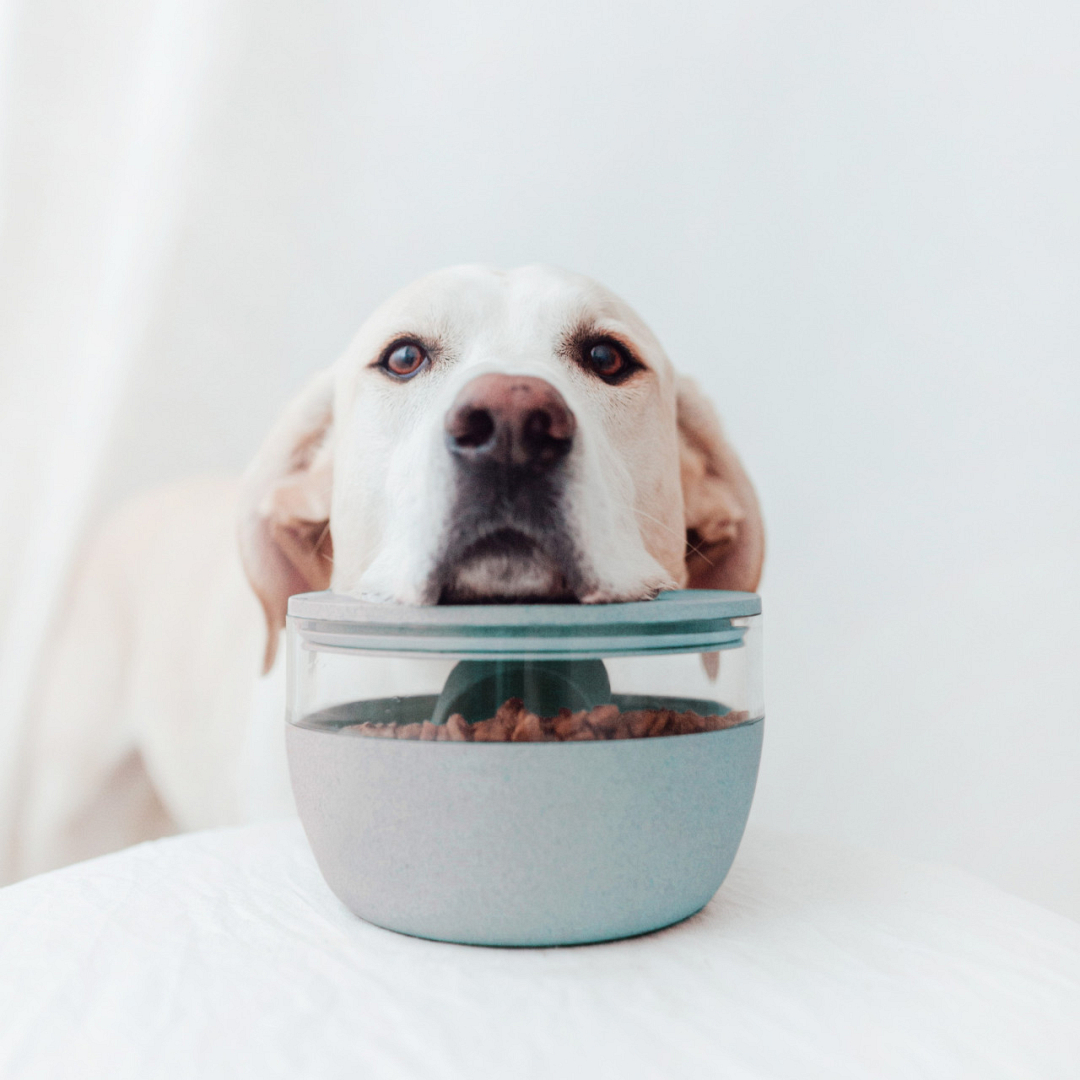 Stevige voorraadpot met bijgeleverd schepje. De vacuüm siliconen sluiting zorgt voor langdurige versheid van snacks of brokjes.