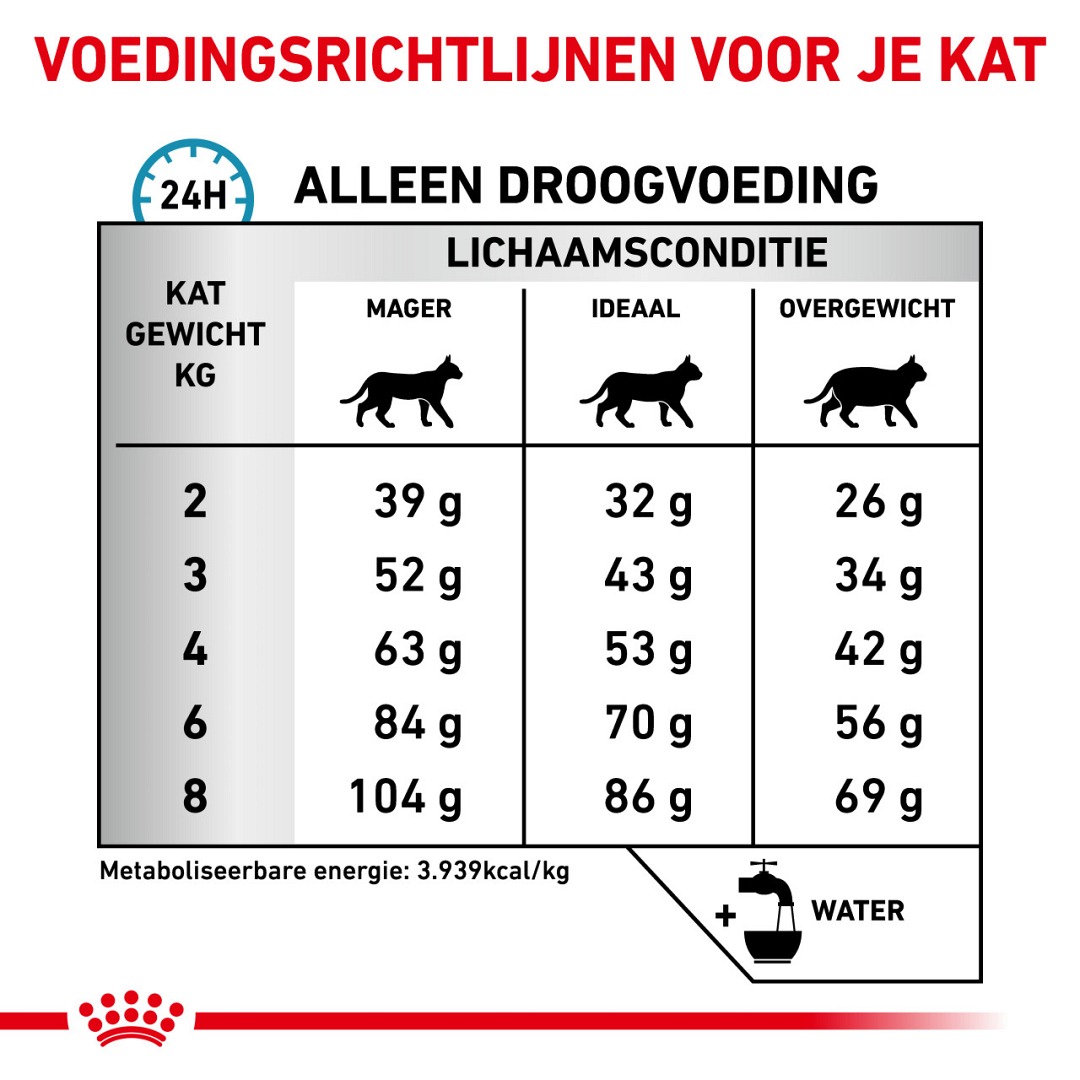 Omdat dit een Royal Canin dieetvoeding is, is het belangrijk dat je deze voeding alleen aan je kat geeft als dit is geadviseerd door je dierenarts. Mocht je overschakelen naar deze voeding, doe dit dan geleidelijk in een tijdsbestek van 7 dagen. Zorg dat je elke dag zorgvuldig de juiste hoeveelheid voeding afweegt, zeker in combinatie met natvoeding.