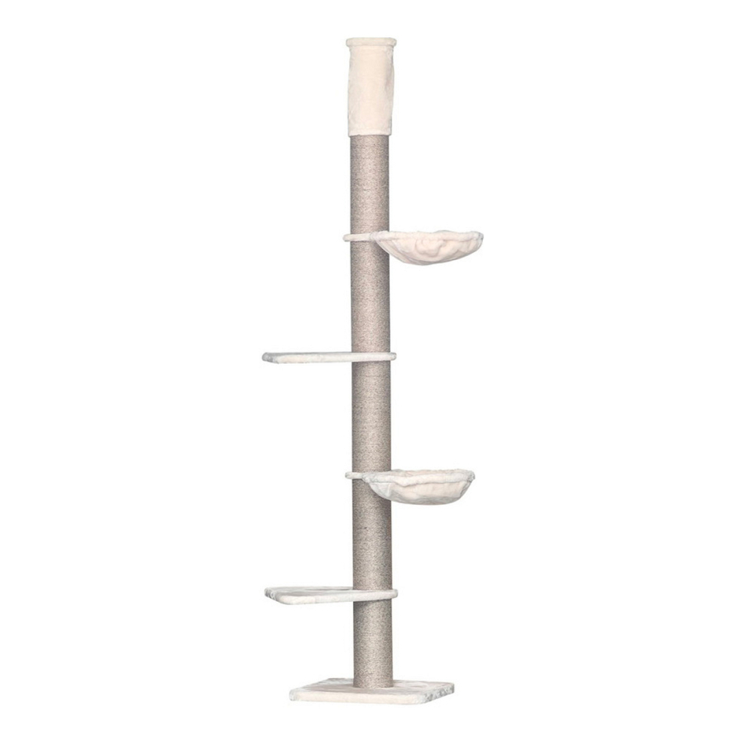 Krabpaal Olympus XXL is een stevige krabpaal voor meerdere en/of grote katten. De hoogte is traploos in te stellen tussen de 250 en 275 cm. Je klemt deze krabpaal dus onder het plafond waardoor het niet noodzakelijk is om in je plafond te boren of te schroeven. De palen hebben een diameter van maar liefst 17 cm. De stevige bodemplaat heeft een afmeting van 60 x 60 cm en is extra zwaar uitgevoerd, voor meer stabiliteit. Krabpaal Olympus is voorzien van meerder plateaus en hangmatten verdeeld over 5 etages (begane grond meegerekend). Iedere verdieping biedt een uitstekend uitzichtpunt waar jouw kat in alle comfort alles in de gaten kan houden. Dankzij de instelbaarheid van de plateaus kun je de krabpaal instellen als een soort draaitrap, hierdoor komt jouw kat eenvoudig op elke verdieping. Dit maakt deze krabpaal buitengewoon geschikt voor niet alleen grotere rassen, zoals bijvoorbeeld de Maine Coon, maar ook voor oudere of minder atletische katten.