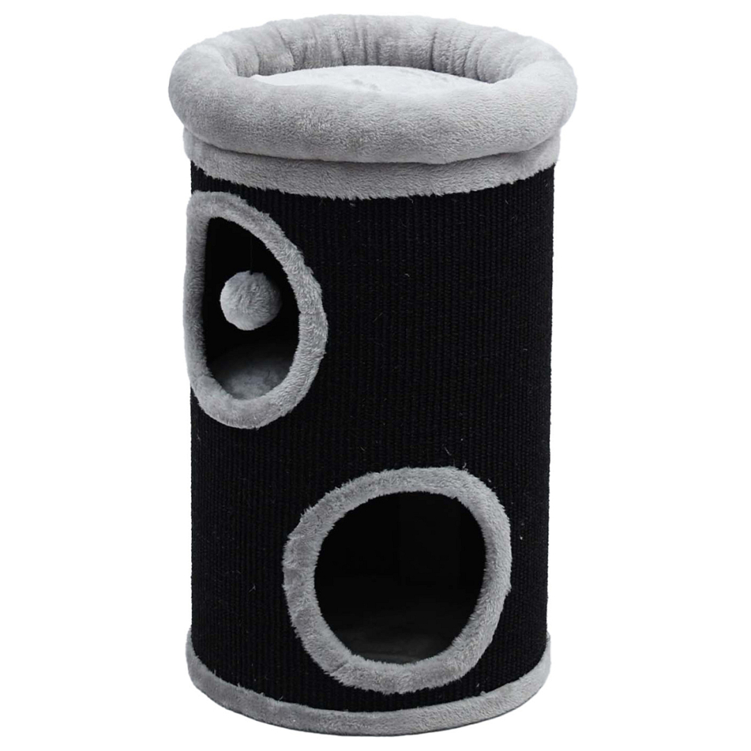 Krabton met 2 gaten en 3 comfortabele slaapplaatsen. Aan de buitenkant bekleed met sisal om de nagels aan te scherpen. Afm. Ø 38 x 66 cm.
