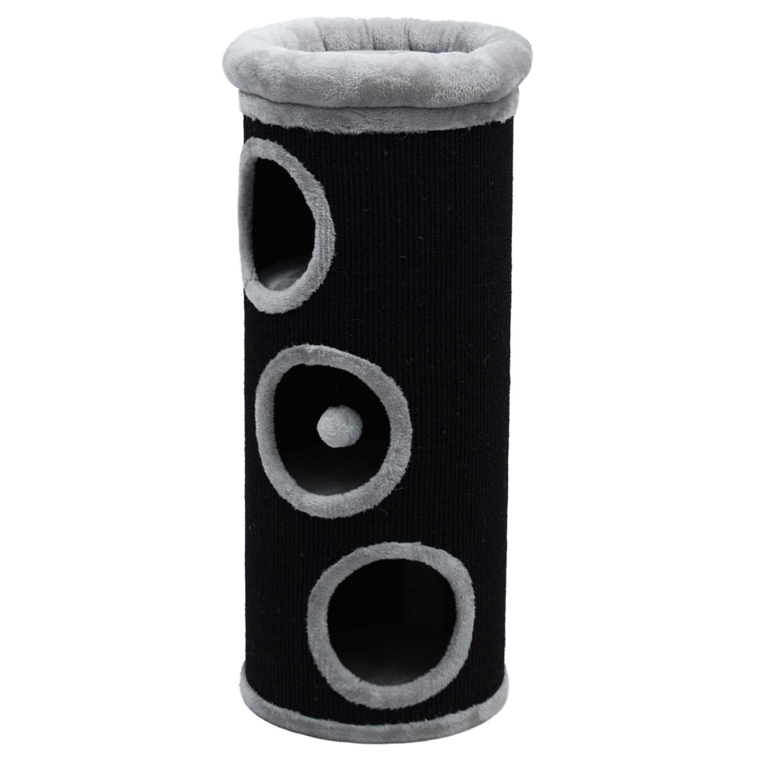 Krabton met 3 gaten en 4 comfortabele slaapplaatsen. Aan de buitenkant bekleed met sisal om de nagels aan te scherpen. Afm. Ø 38 x 95 cm.