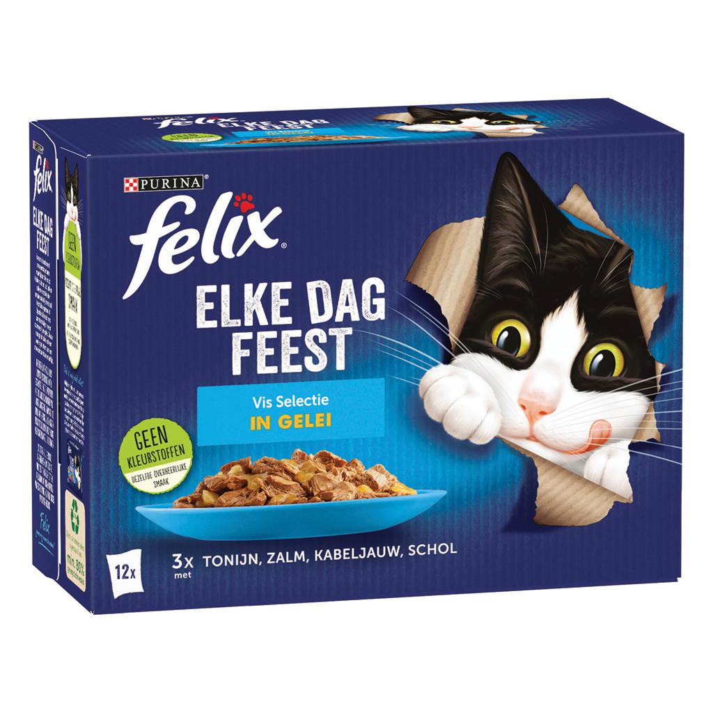 Felix Elke Dag Feest Vis Selectie in gelei zijn onweerstaanbare maaltijden die er zó lekker uitzien en zó lekker ruiken alsof je het zelf hebt klaargemaakt. Elke maaltijd bevat malse stukjes in een heerlijke gelei, voor een onweerstaanbare maaltijd voor jouw kat. Felix Elke Dag Feest is een assortiment van heerlijke maaltijden om jouw kat de variatie te bieden waar hij zo van houdt.