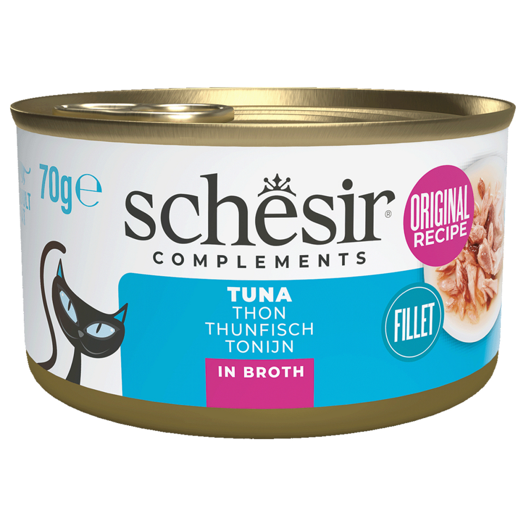 Schesir kattenvoer Complements tonijn in bouillon is gebaseerd op echte filets van heerlijke tonijn. Deze voeding in bouiilon zal zeker favoriet zijn bij katten die dol zijn op de smaken van de zee en een meer vloeibare consistentie.