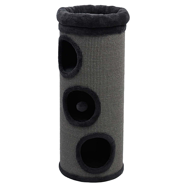 Krabton met 3 gaten en 4 comfortabele slaapplaatsen. Aan de buitenkant bekleed met sisal om de nagels aan te scherpen. Afm. Ø 38 x 95 cm.